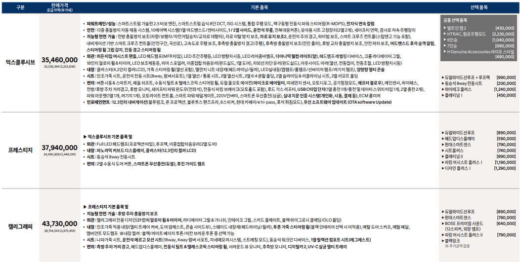 프레스티지 대비 3가지 트림으로 구성되어 있고, 기본트림인 익스클루시브에 웬만한 옵션들이 기본적으로 구성되어 있습니다.