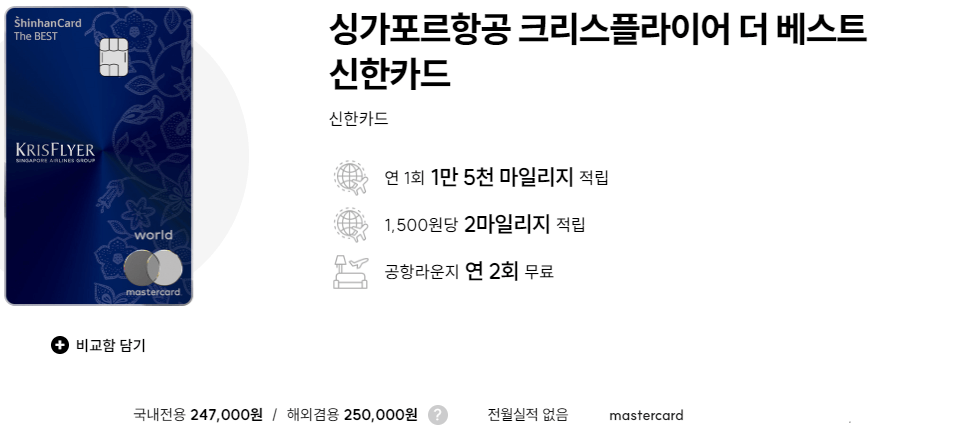 신한카드와 싱가포르항공의 합작품으로, 국내에서는 최초의 외항사 마일리지 적립카드이다.